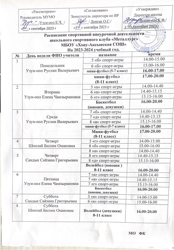 Расписание спортивных секций и кружков